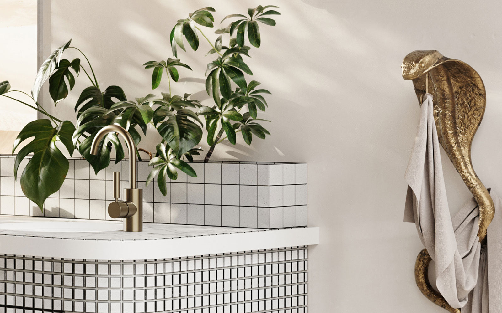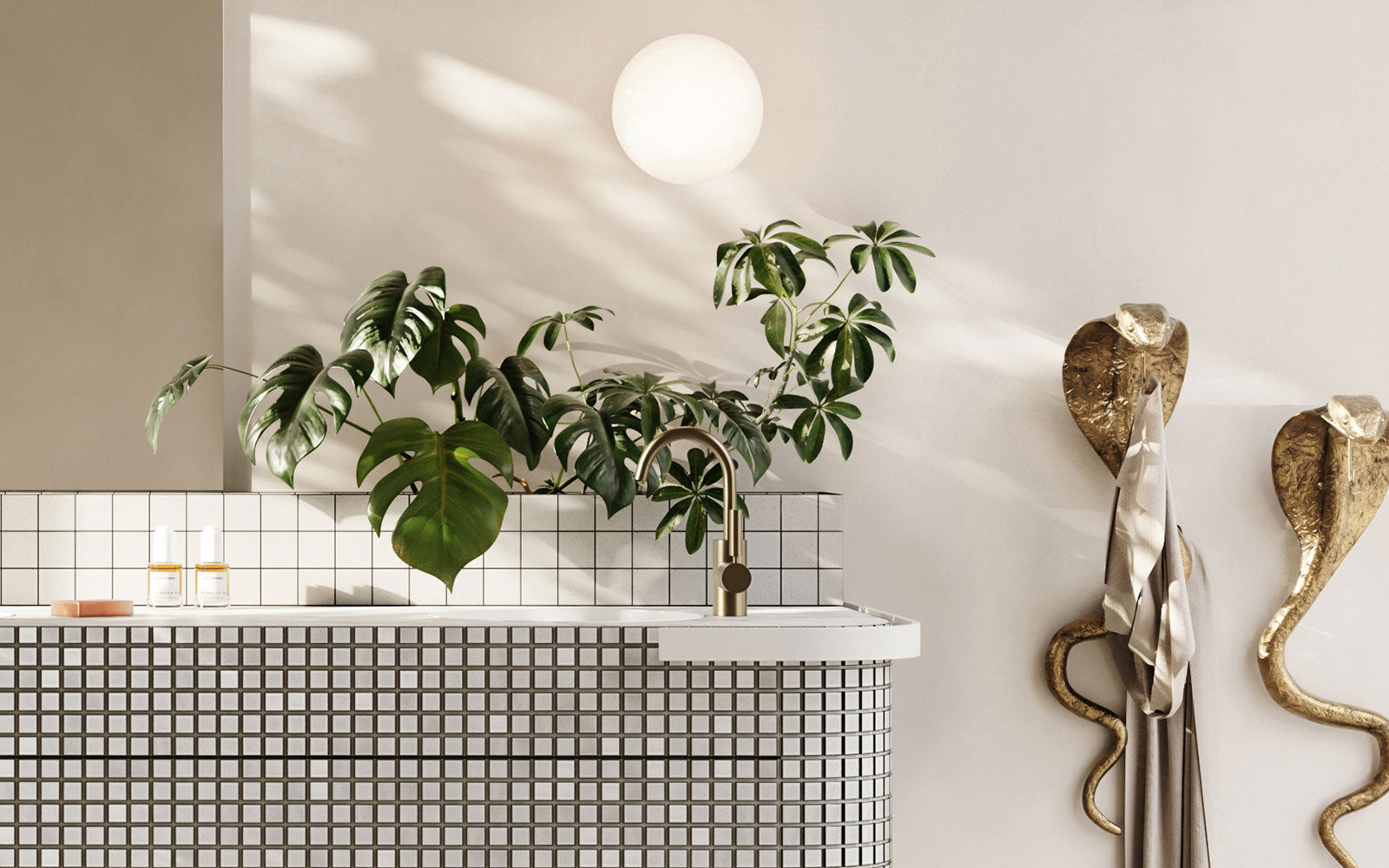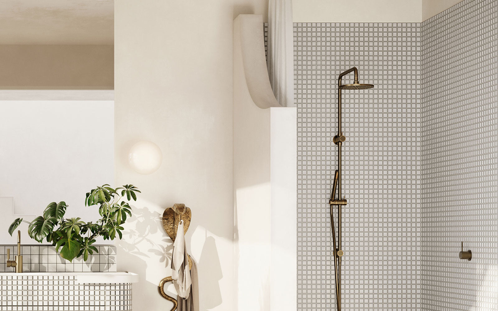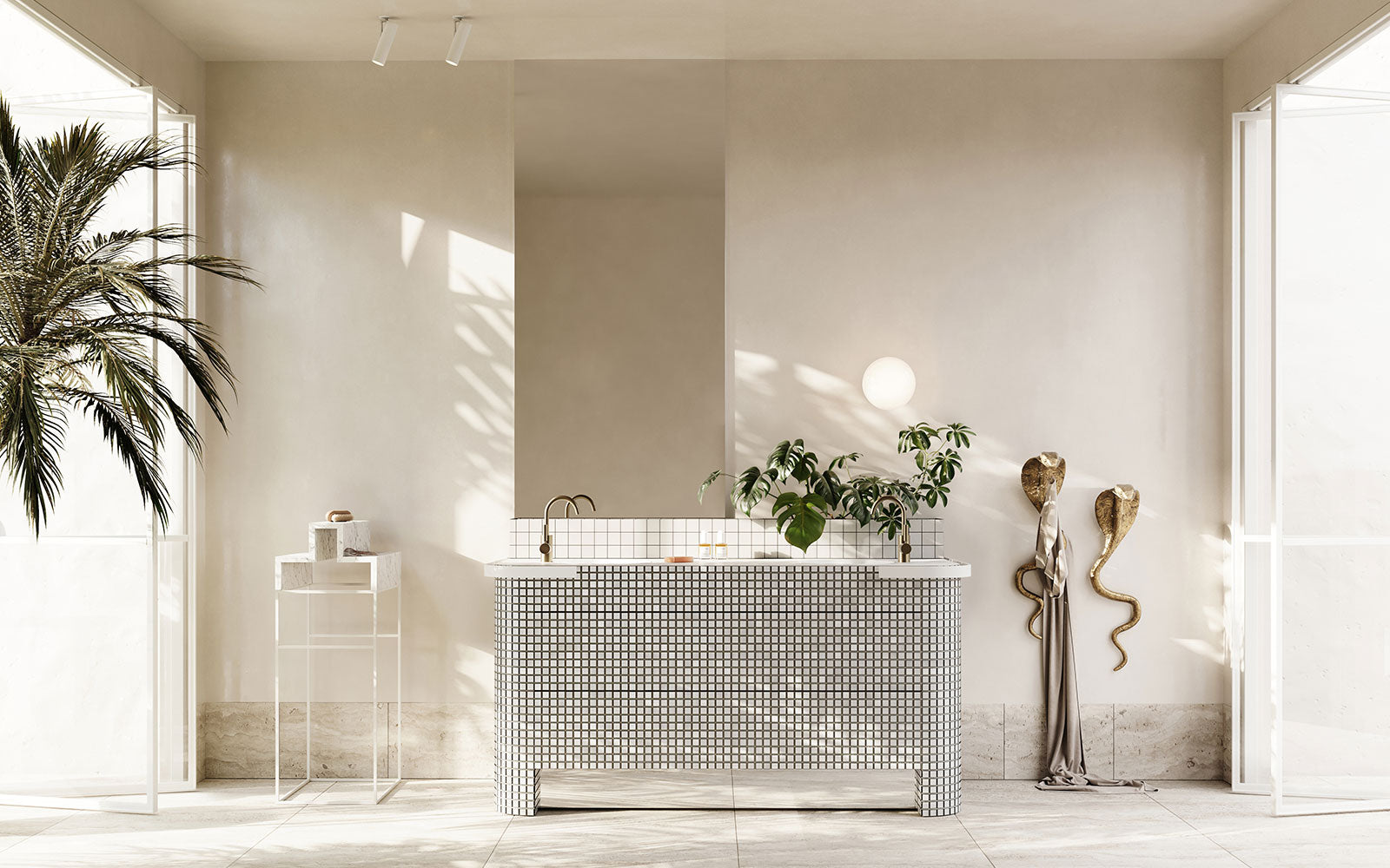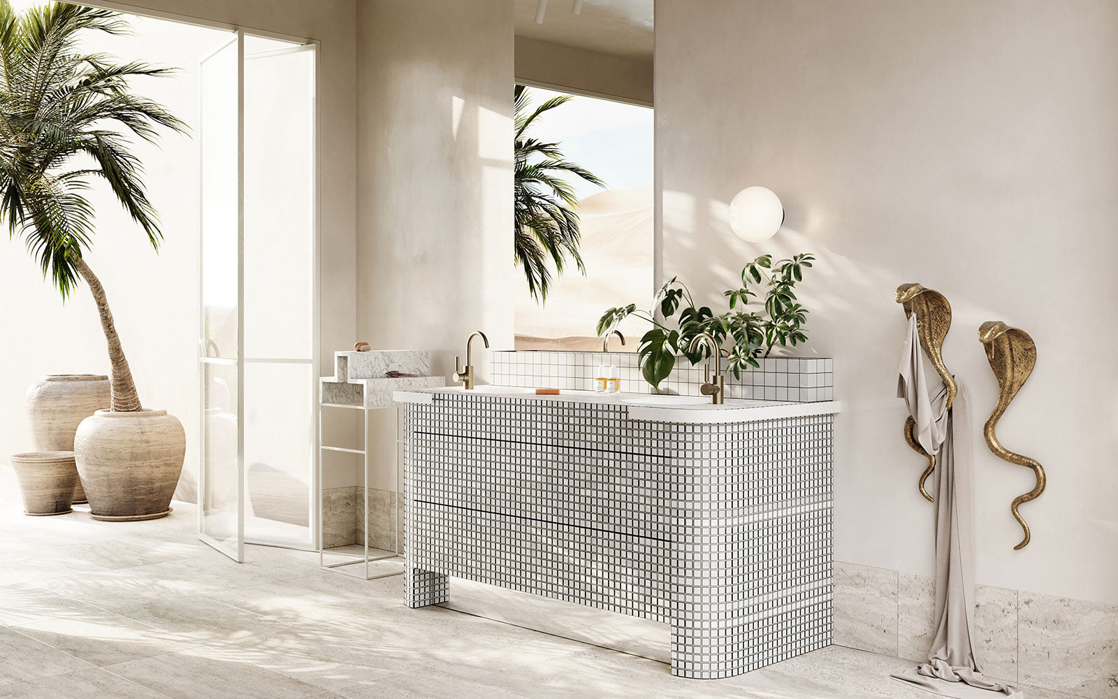 Curated with a fresh and light reflective pallet, this bathroom has been designed with a modern Cleopatra in mind. Pharaoh’s vanity is wrapped in shimmering mosaic tiles, with concealed storage drawers that hold all of your daily essentials whilst a thoughtful towel rail hugs the curved form shaping your vanity of dreams. Mosaic tiles available in Ivory or Olive.