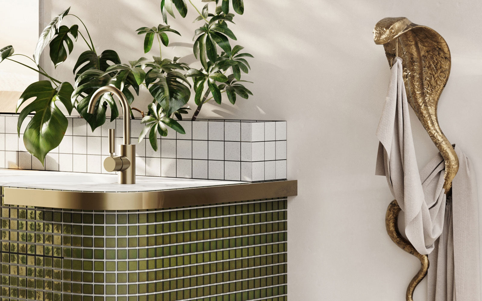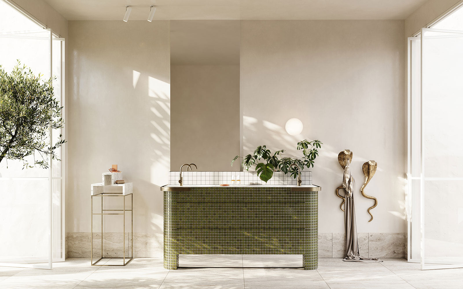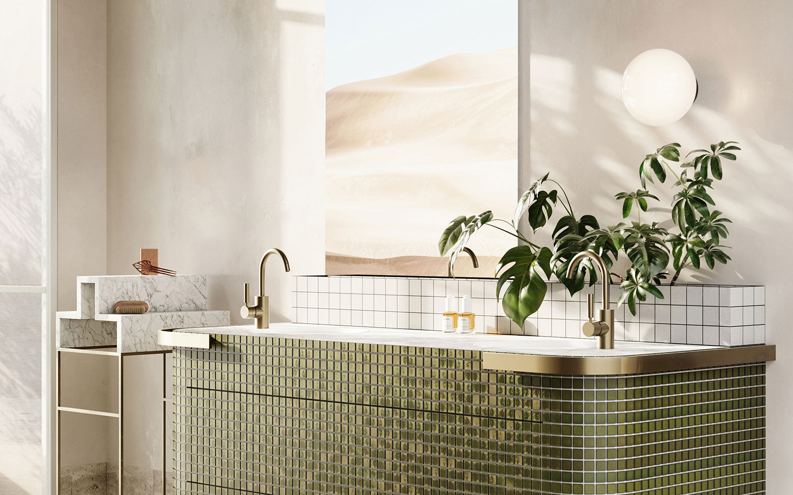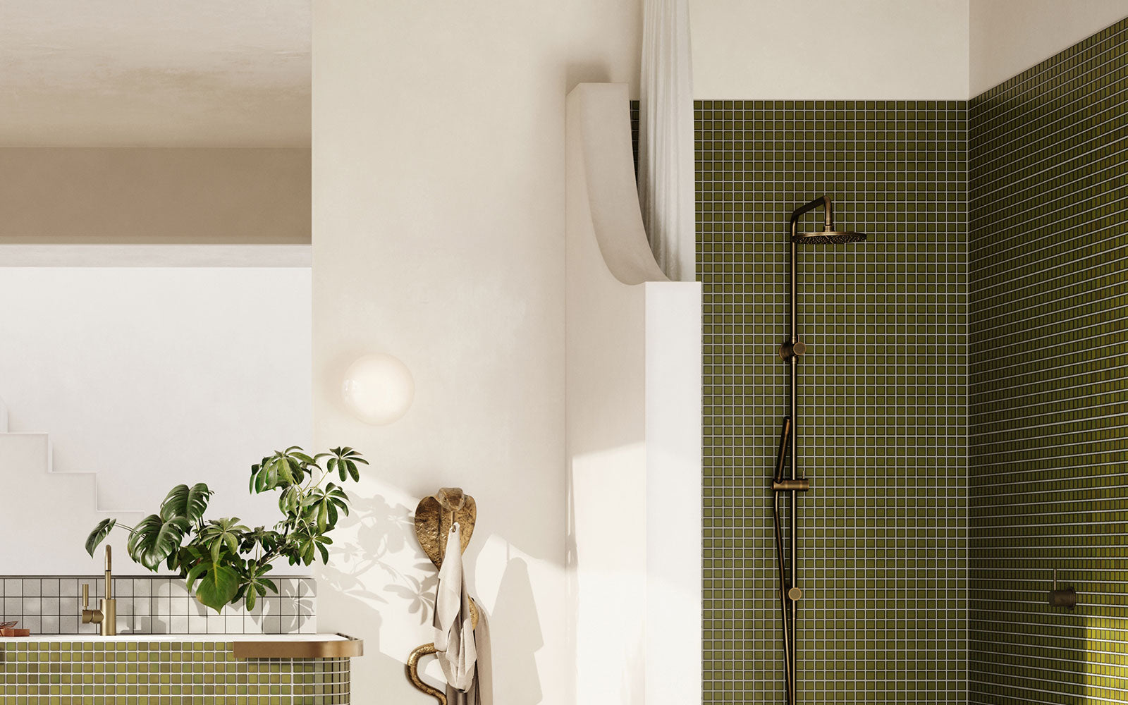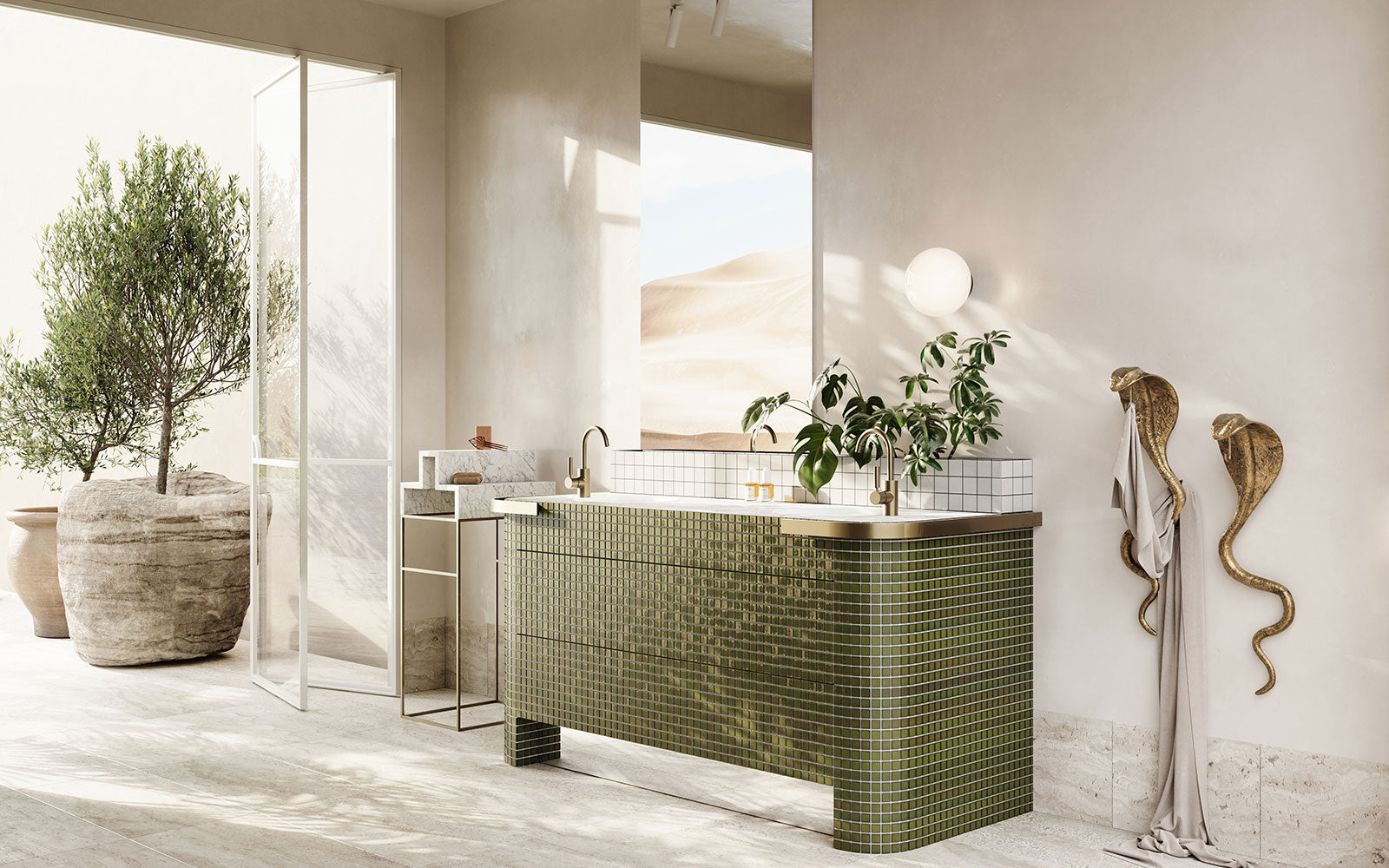Curated with a fresh and light reflective pallet, this bathroom has been designed with a modern Cleopatra in mind. Pharaoh’s vanity is wrapped in shimmering mosaic tiles, with concealed storage drawers that hold all of your daily essentials whilst a thoughtful towel rail hugs the curved form shaping your vanity of dreams. Mosaic tiles available in Ivory or Olive.