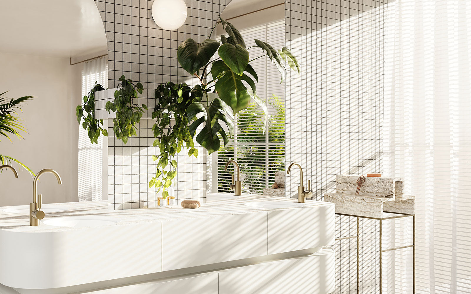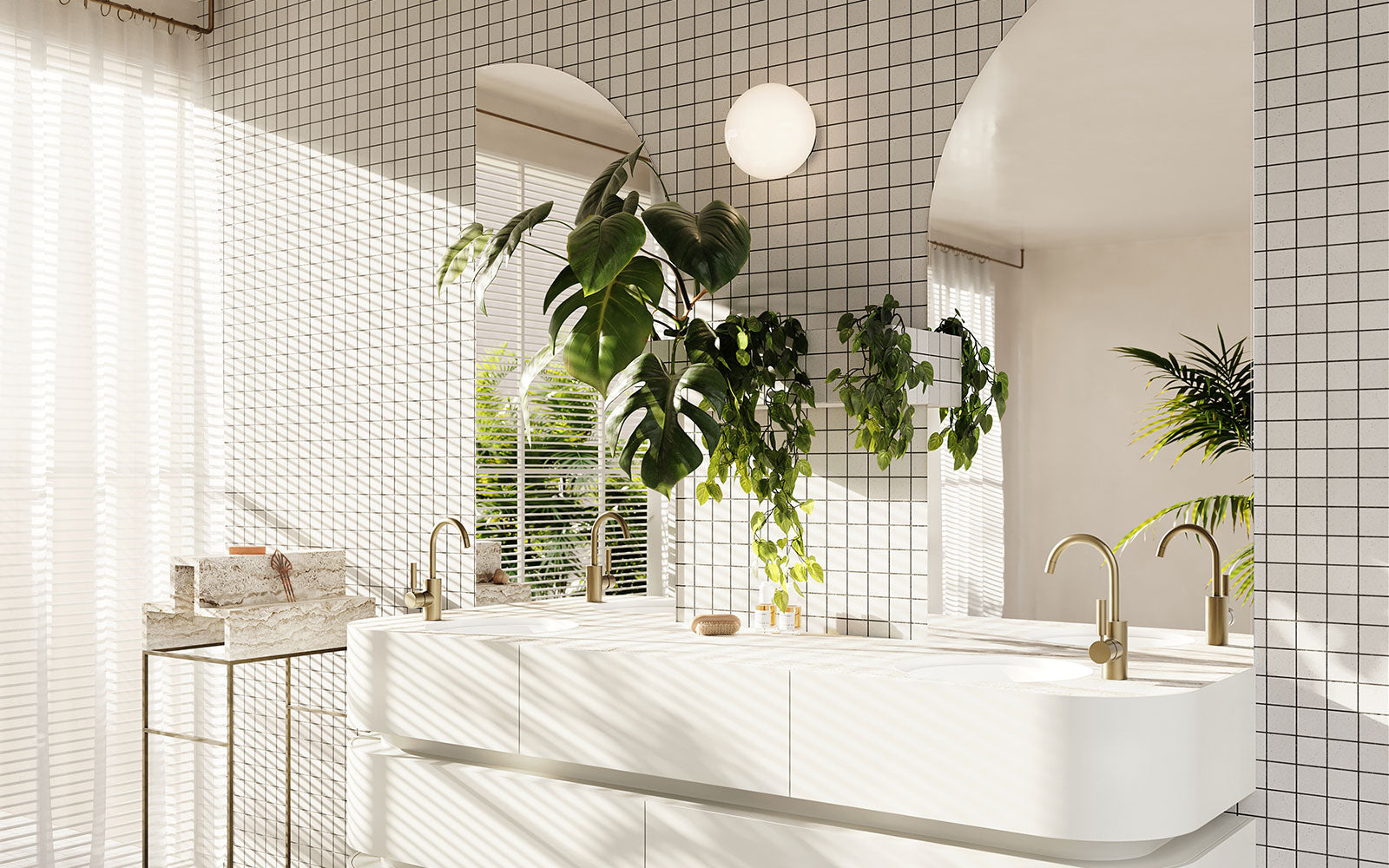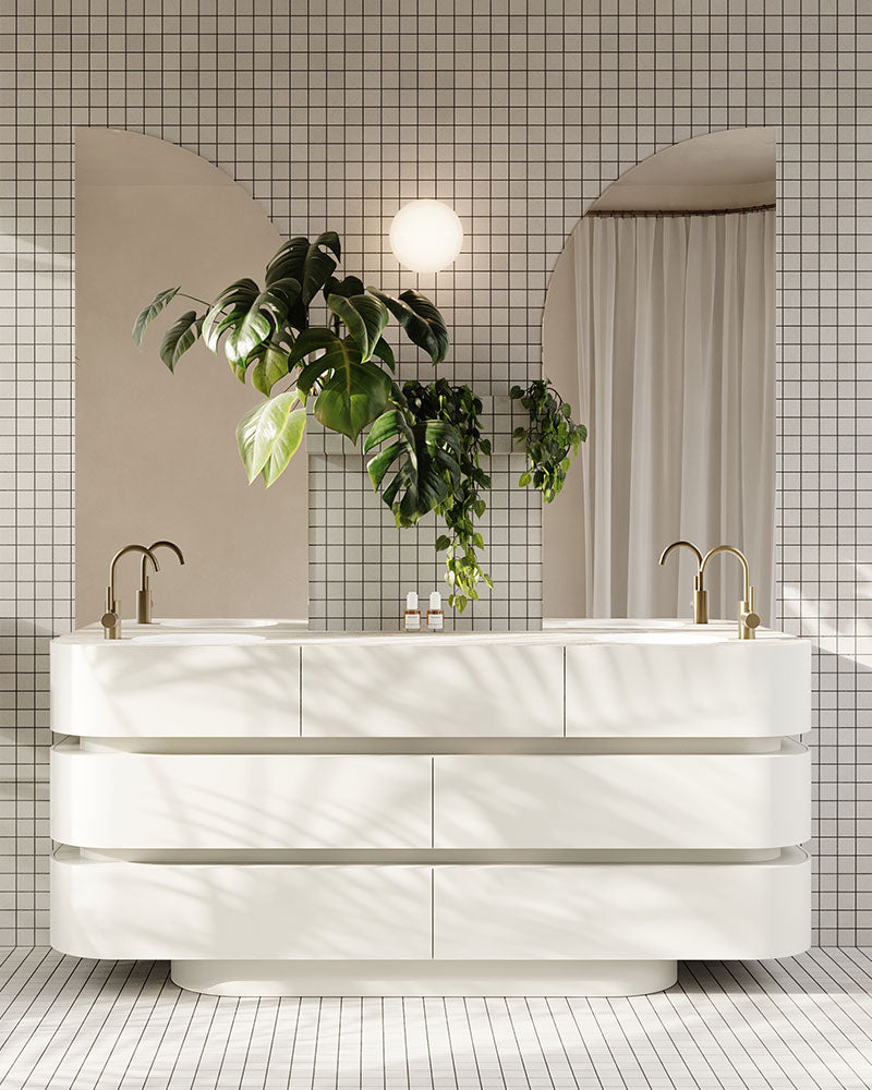 A curvaceous soft powder white vanity exudes slow luxury in a clean modern setting for the ultimate elevated bathroom living.